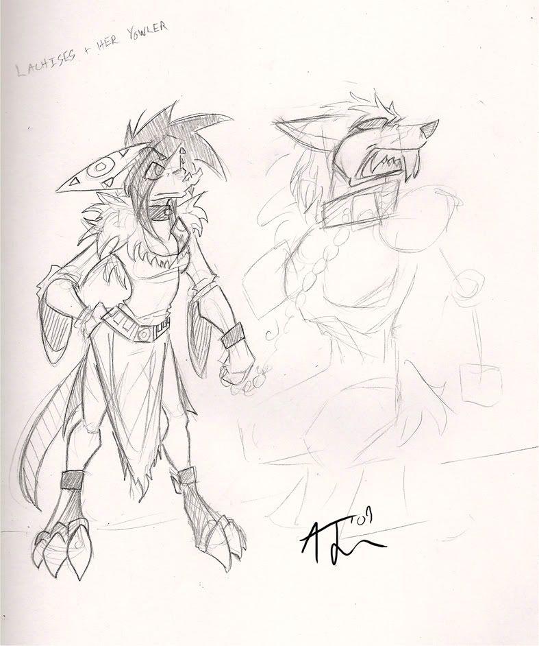 Above. Just a working sketch. Going to move the Yowler up more and extend his legs. He's tall, muscular torso and lanky.